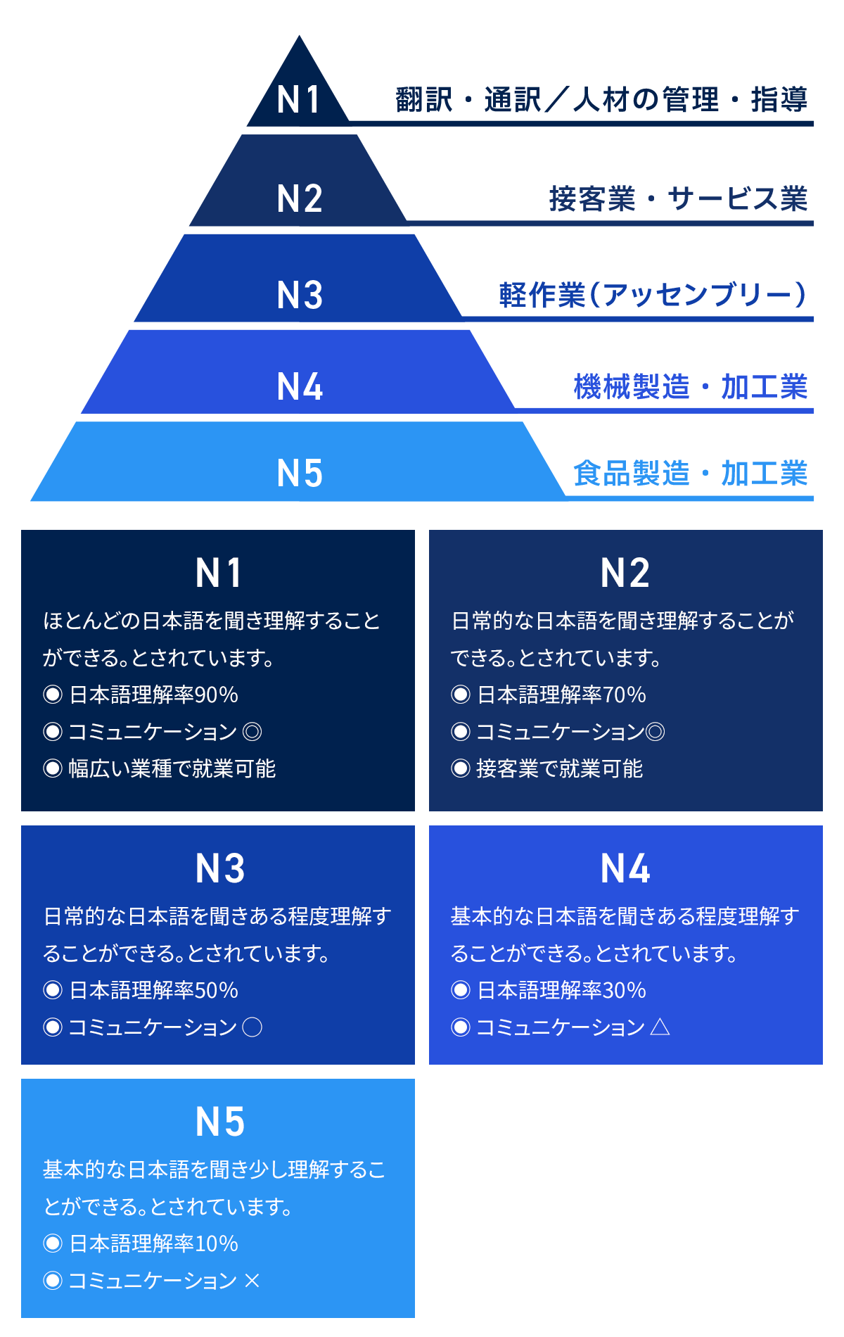 特に外国人派遣では、スタッフの日本語能力を5段階(N1~N5)で明確に管理し、業務レベルに応じた最適な人材を配置します。